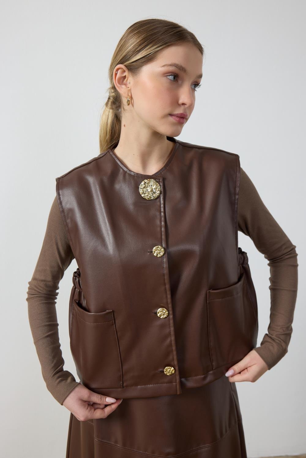 Acı Kahverengi Cep Detaylı Deri Yelek
