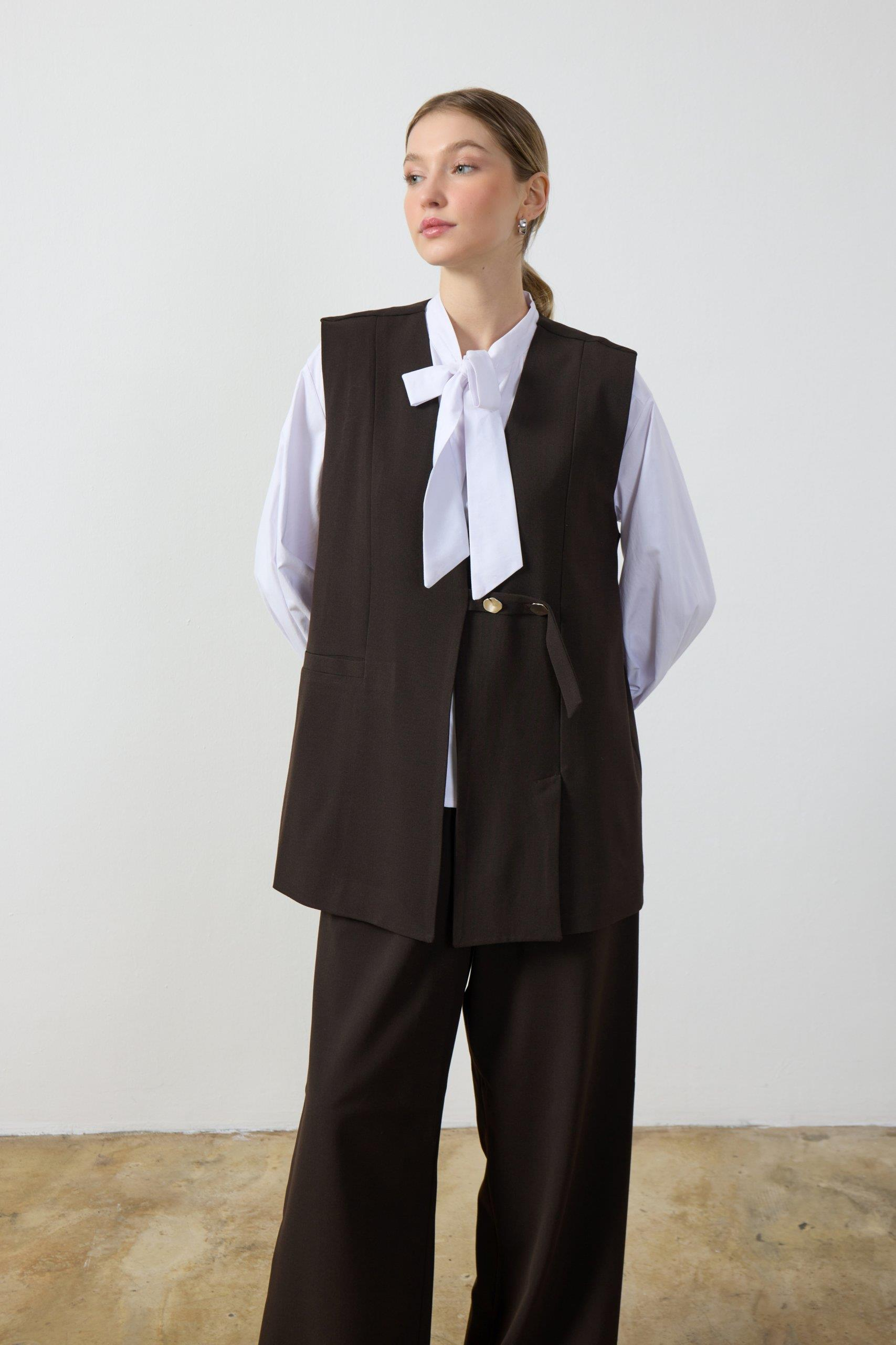 Düğme detaylı, Ayarlanabilir kuşaklı, V yaka, Ürün tam kalıptır.