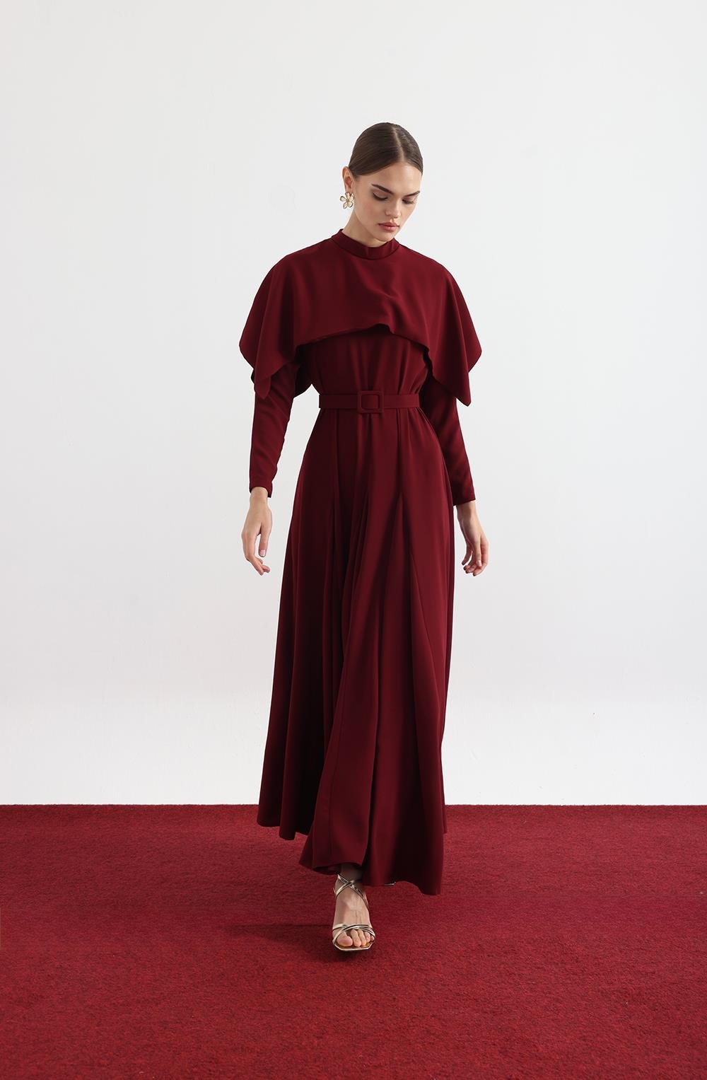 Bordo Asimetrik Kesim Pelerinli Elbise