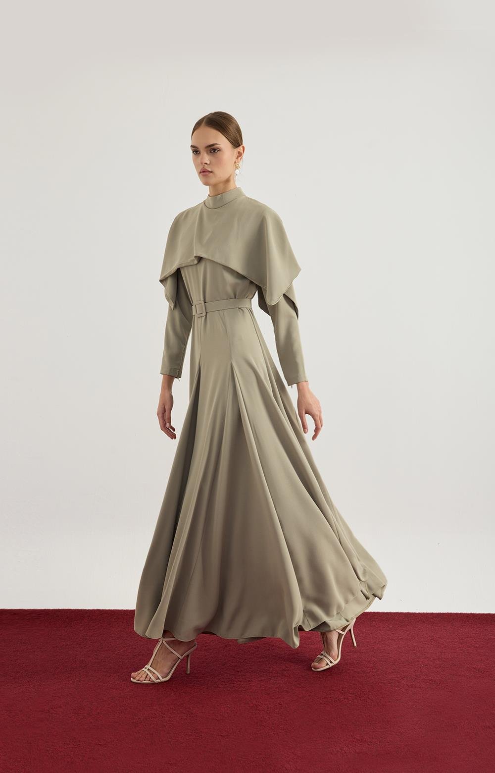 Çağla Asimetrik Kesim Pelerinli Elbise