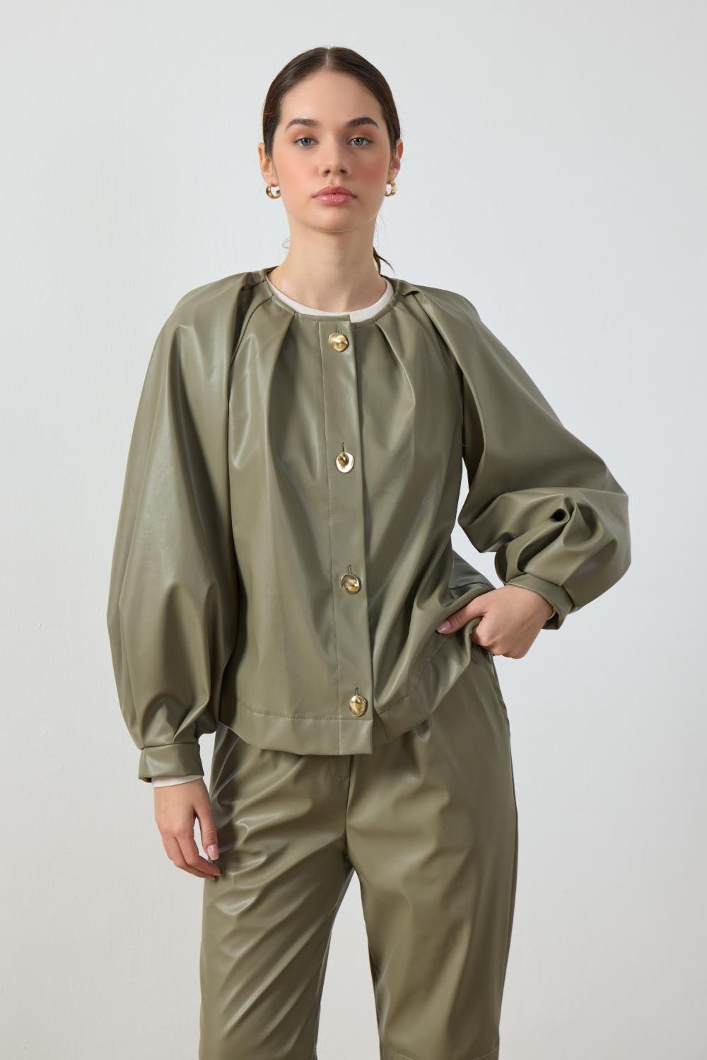 Düğme detaylı, Bisiklet yaka, Balon kol, Suni deri kumaş Tam kalıp, Ürün astarlıdır.