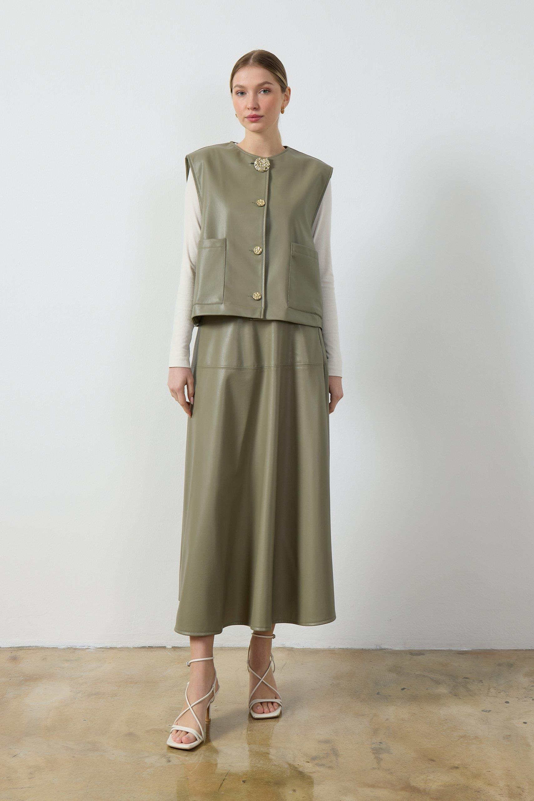 Düğme detaylı, Bisiklet yaka, Suni deri kumaş, Tam kalıp, Ürün astarlıdır.