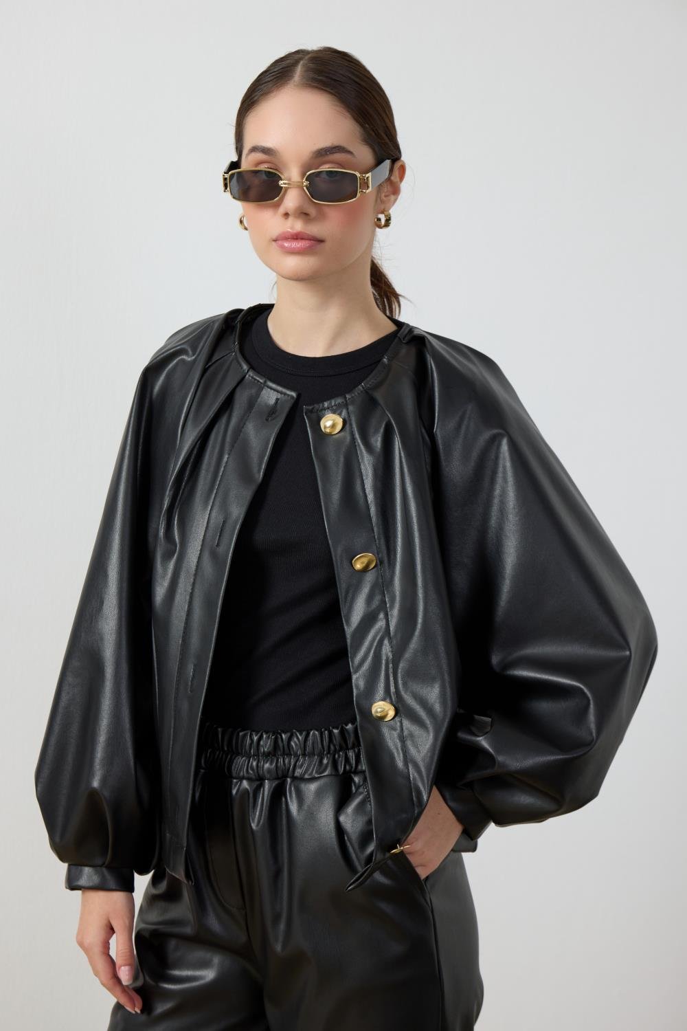 Düğme detaylı, Bisiklet yaka, Balon kol, Suni deri kumaş Tam kalıp, Ürün astarlıdır.
