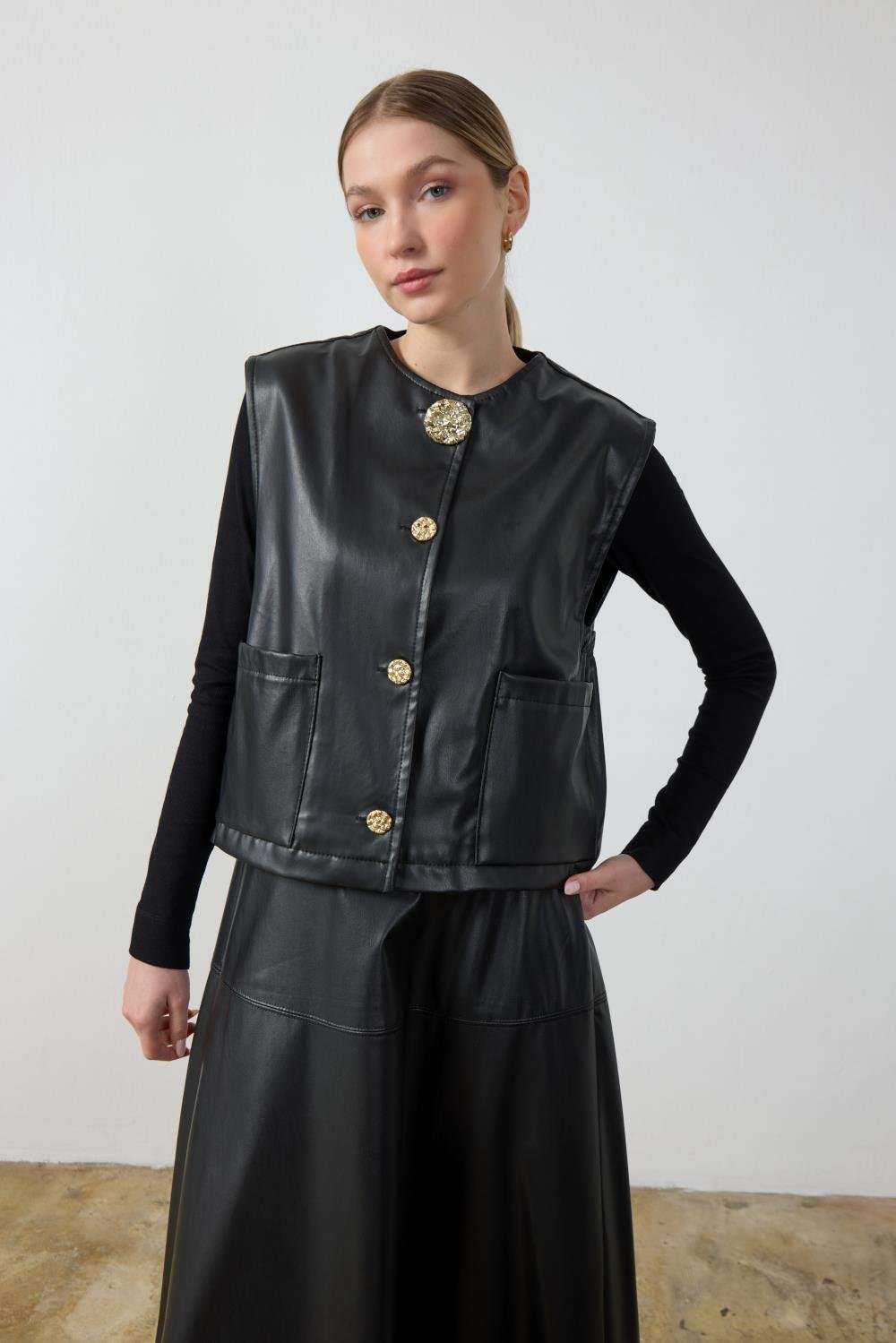 Düğme detaylı, Bisiklet yaka, Suni deri kumaş, Tam kalıp, Ürün astarlıdır.