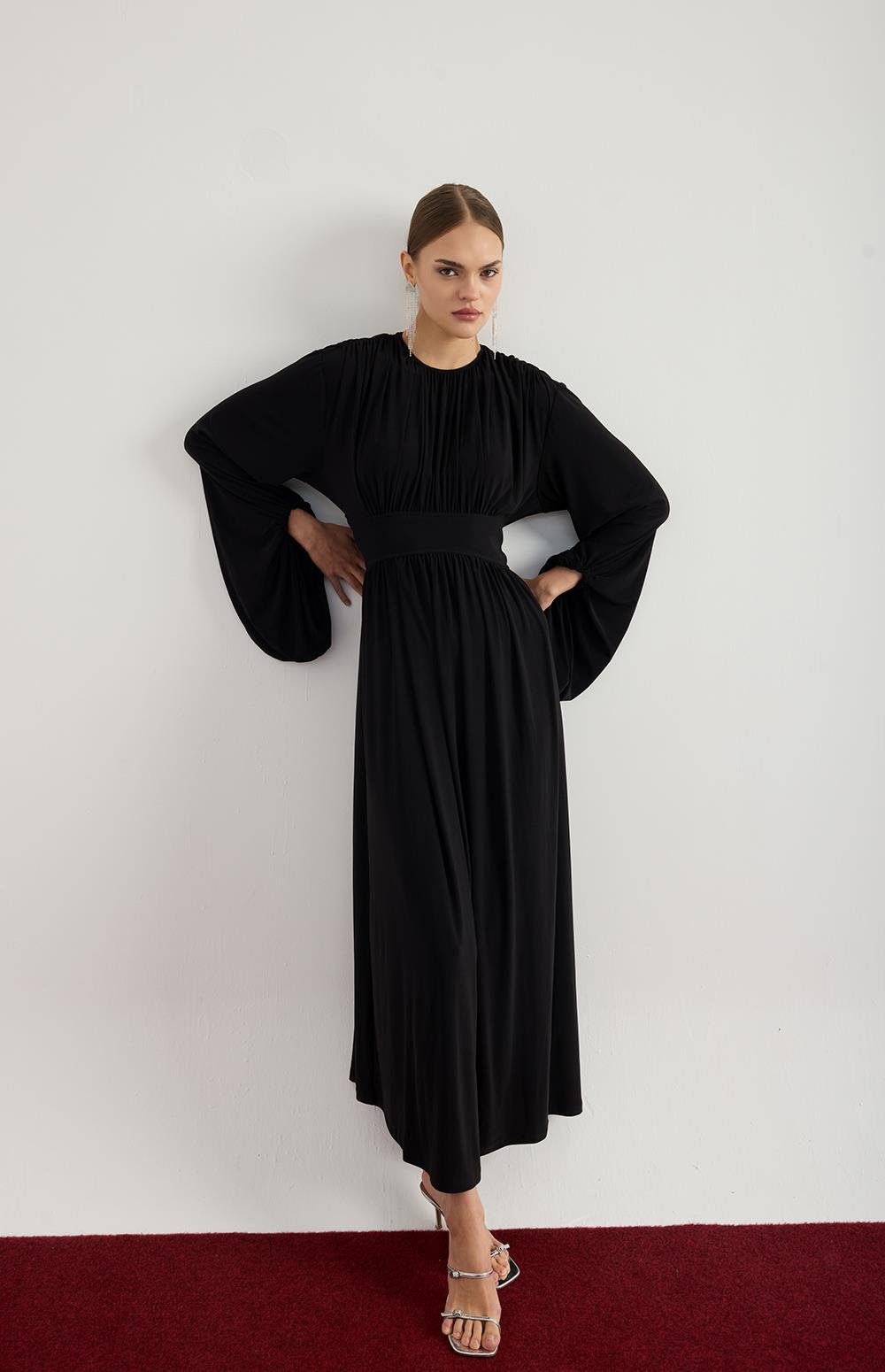 Siyah Geniş Balon Kol Büzgülü Elbise