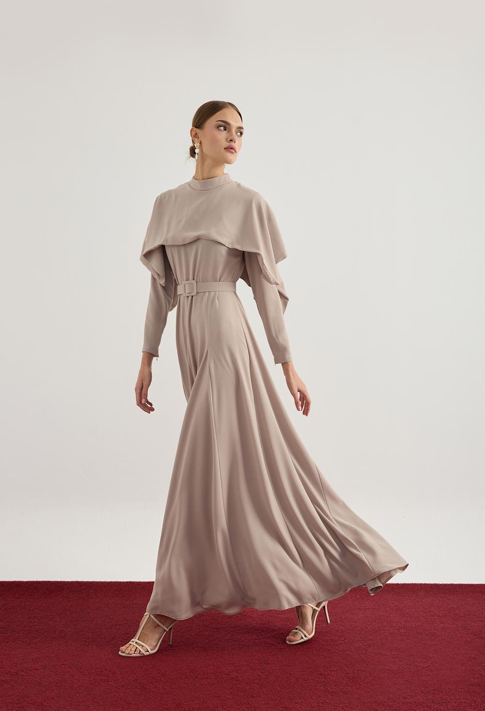 Asimetrik kesimiyle sıradanlıktan uzak, pelerin detayıyla ise büyüleyici bir etki yaratan bu elbise, iddialı tarzların vazgeçilmezi. Hafif kumaşı ve akıcı tasarımıyla özel davetlerde zarafetin simgesi olur.