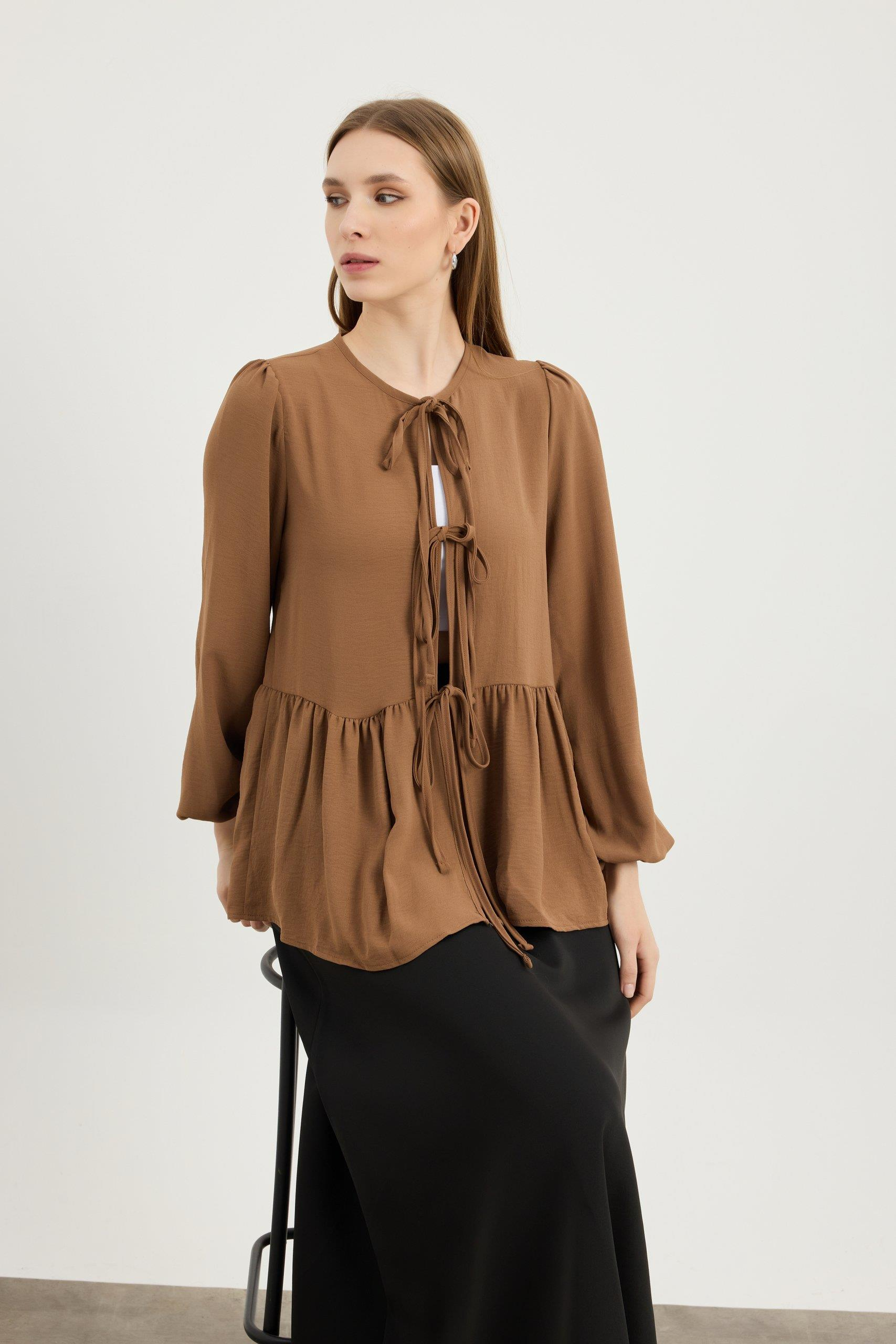 Ayarlanabilir bel detayı, Ayrobin kumaş, Düşük omuz, lastikli bilek detayı.