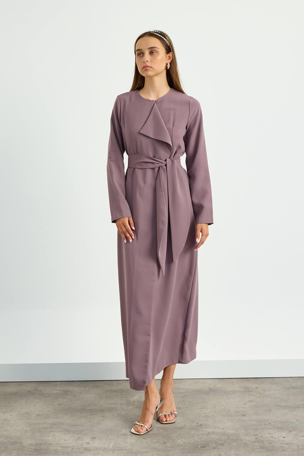 Gül Kurusu Yaka Detaylı Kuşaklı Elbise