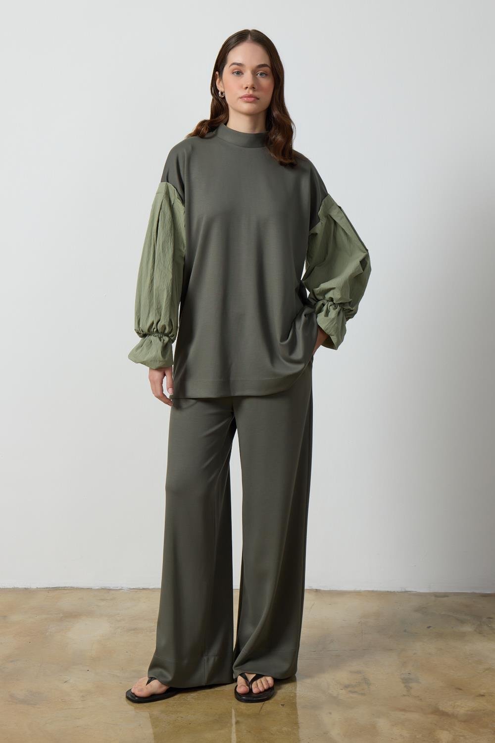 Haki Büzgülü Kol Detaylı Pantolon Takım