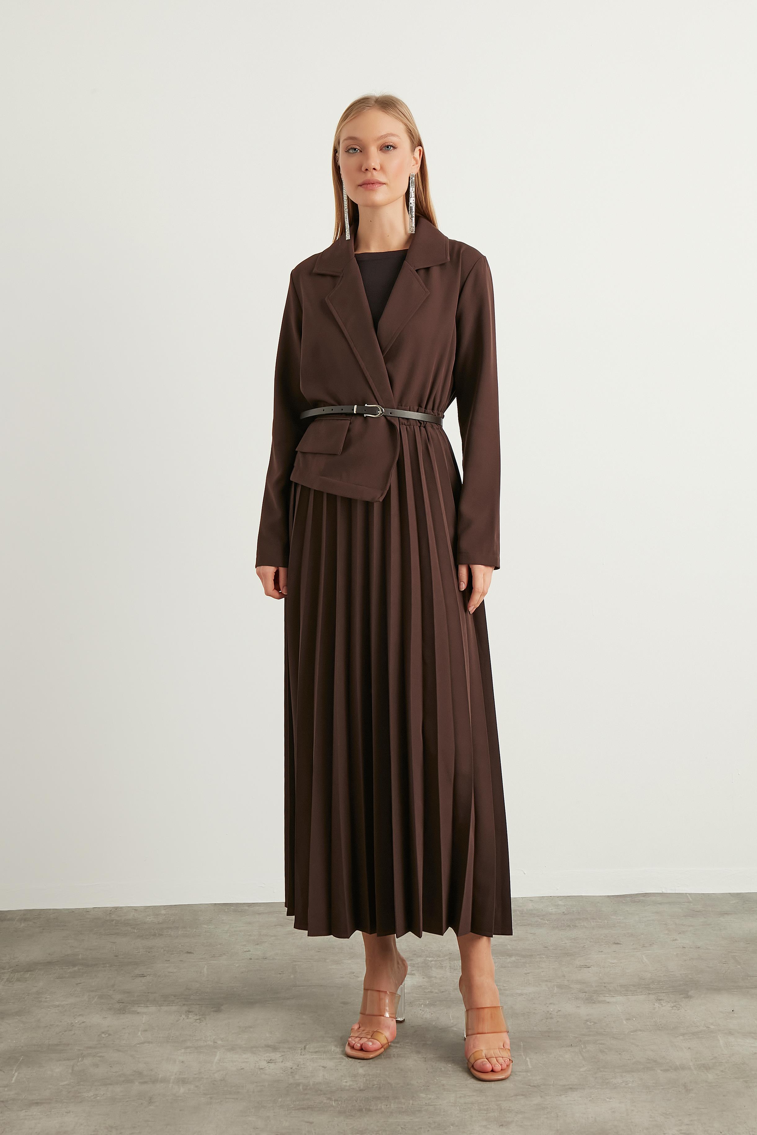 Kruvaze Yaka, Pile Detaylı Etek, Double Krep Kumaş, Tam Kalıp, Kemer Detaylı. *Kısa programda tek başına yıkama yapınız. Düşük ısıda ütüleyiniz.