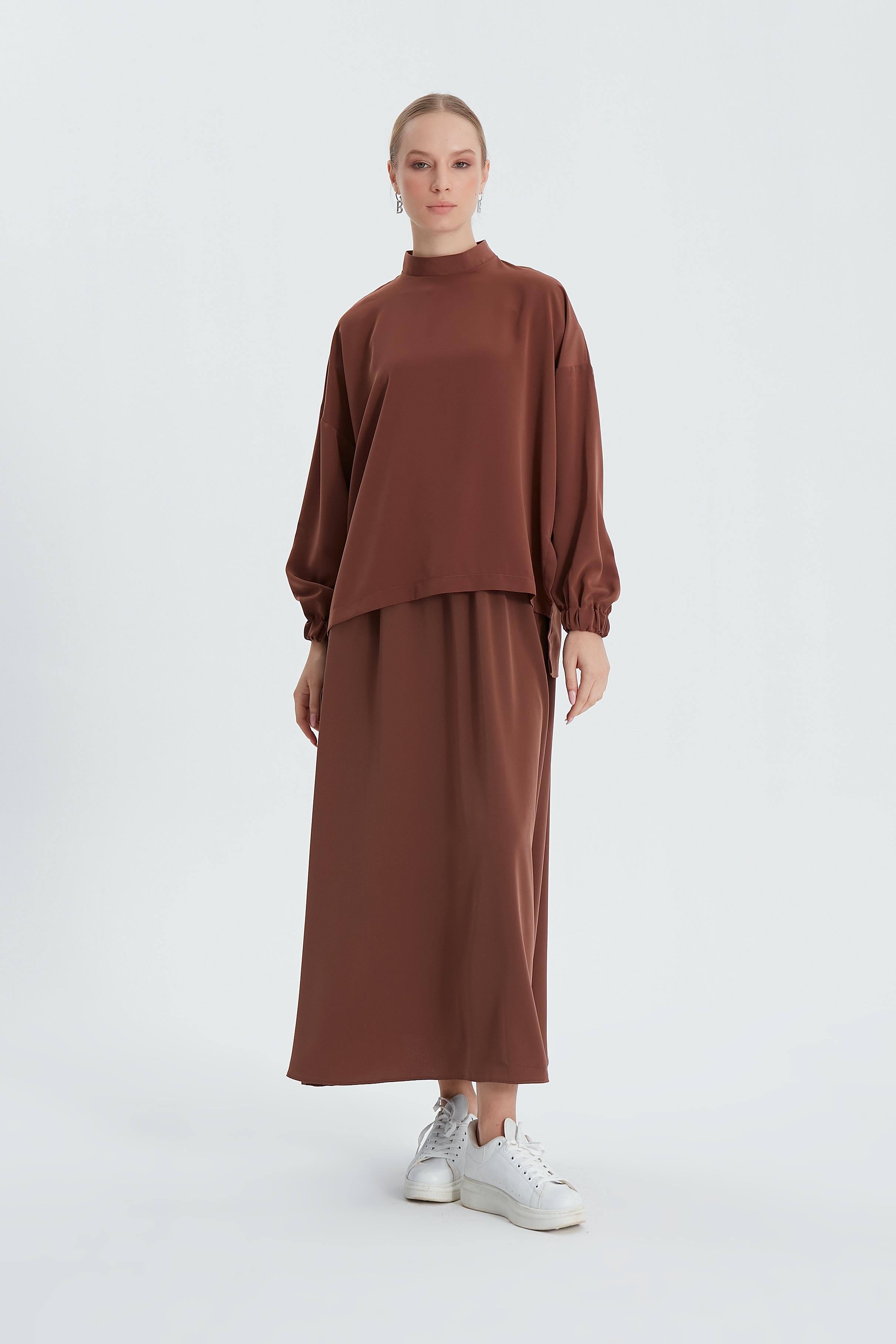 Arkadan fermuar detaylı, dik yaka, 36-42 beden arası uyumlu, krep kumaştan üretilmiştir.