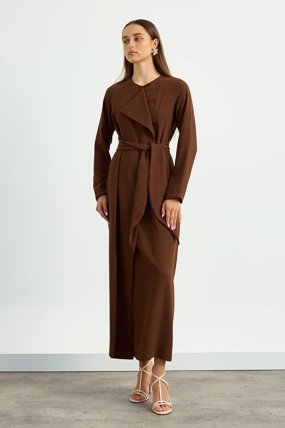Kahverengi Yaka Detaylı Kuşaklı Elbise