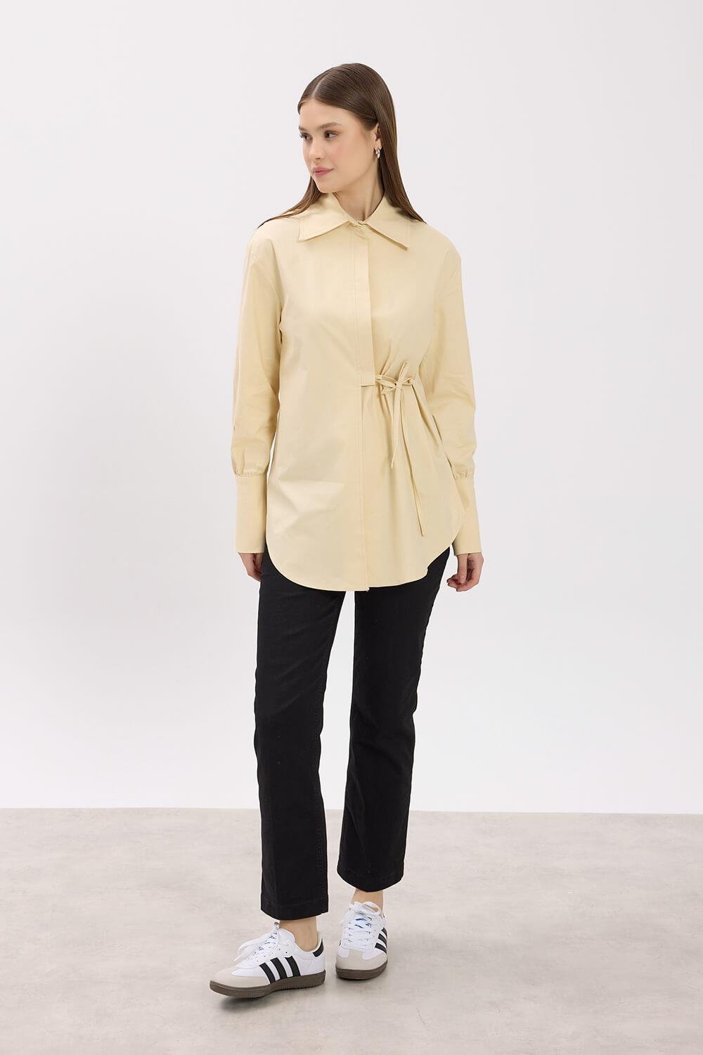 Krem Bağlama Detaylı Klasik Yaka Gömlek