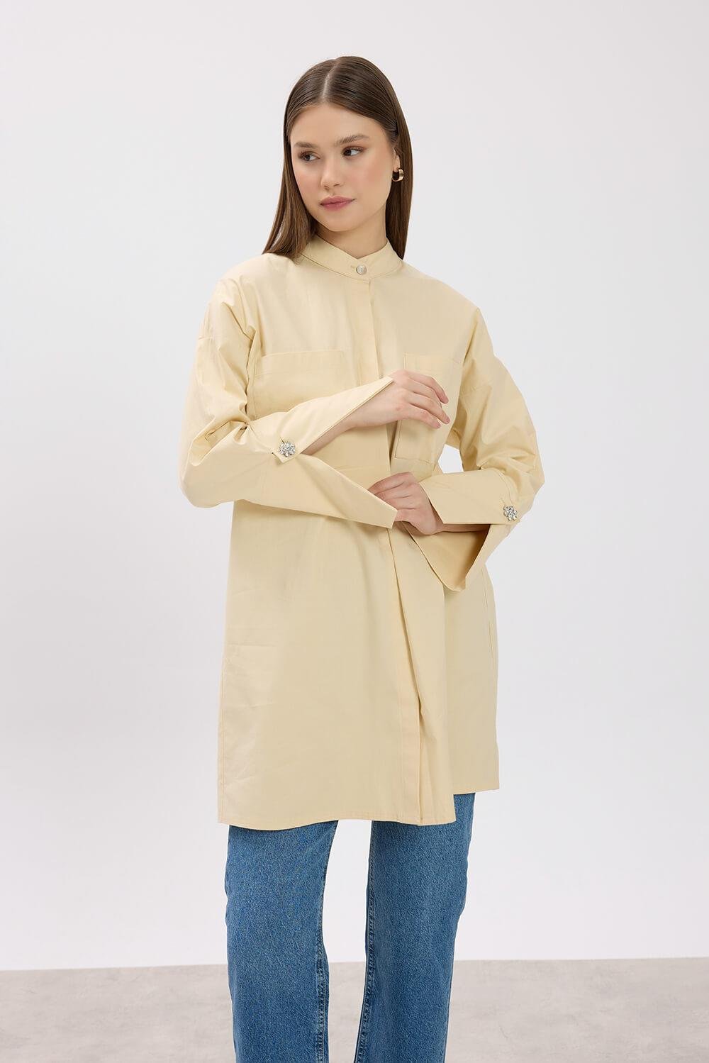 Krem Hakim Yaka Detaylı Cepli Tunik