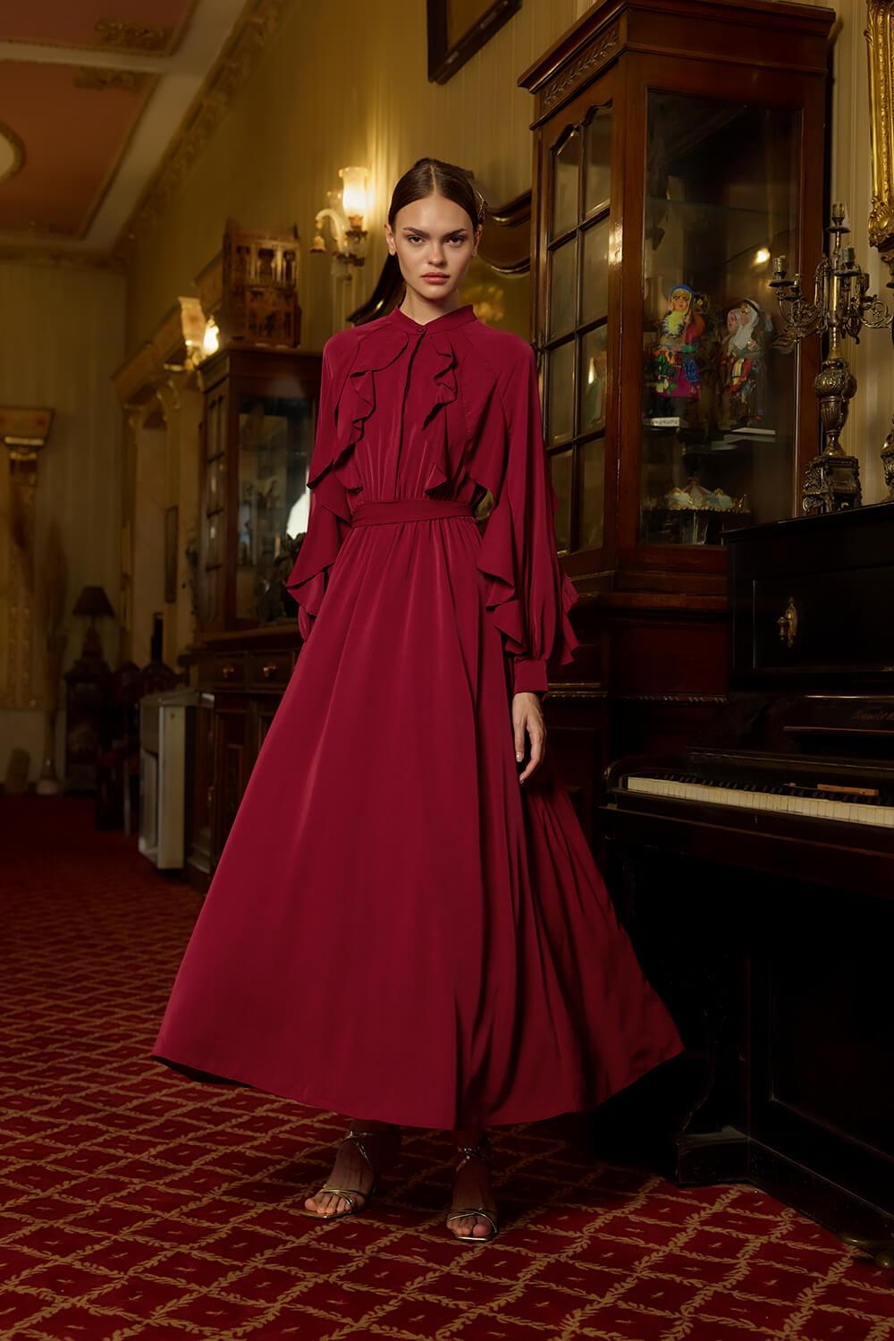 Yüksek yaka, Volan Detaylı Astarlı, Kristal krep kumaş, Ayarlanabilir seyyar kuşaklı. *Kısa programda tek başına yıkama yapınız. Düşük ısıda ütüleyiniz.