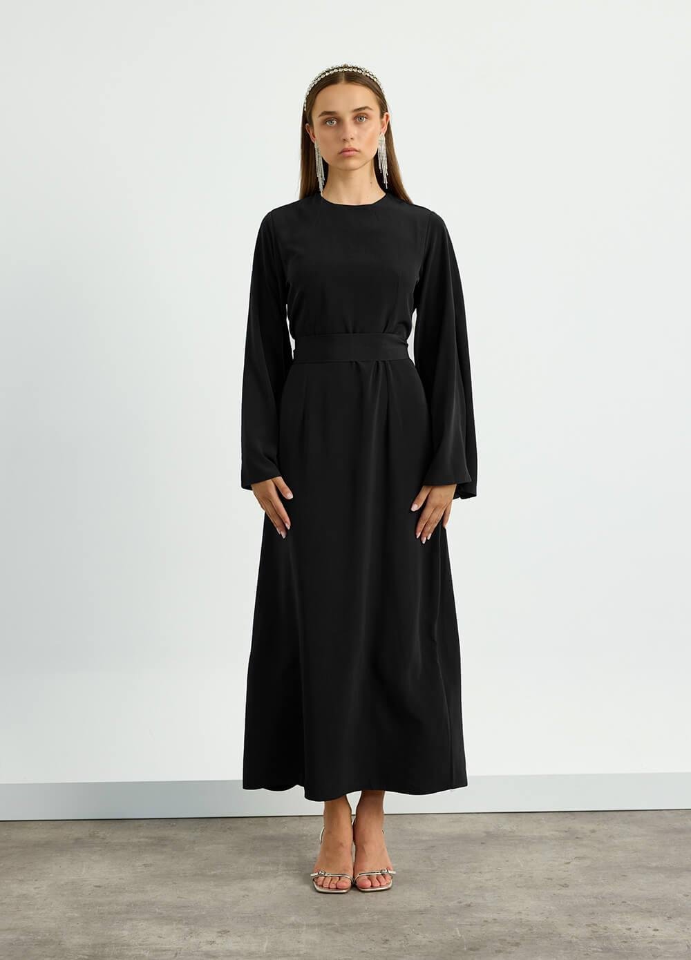 Siyah Kolu Volanlı Kemerli Elbise