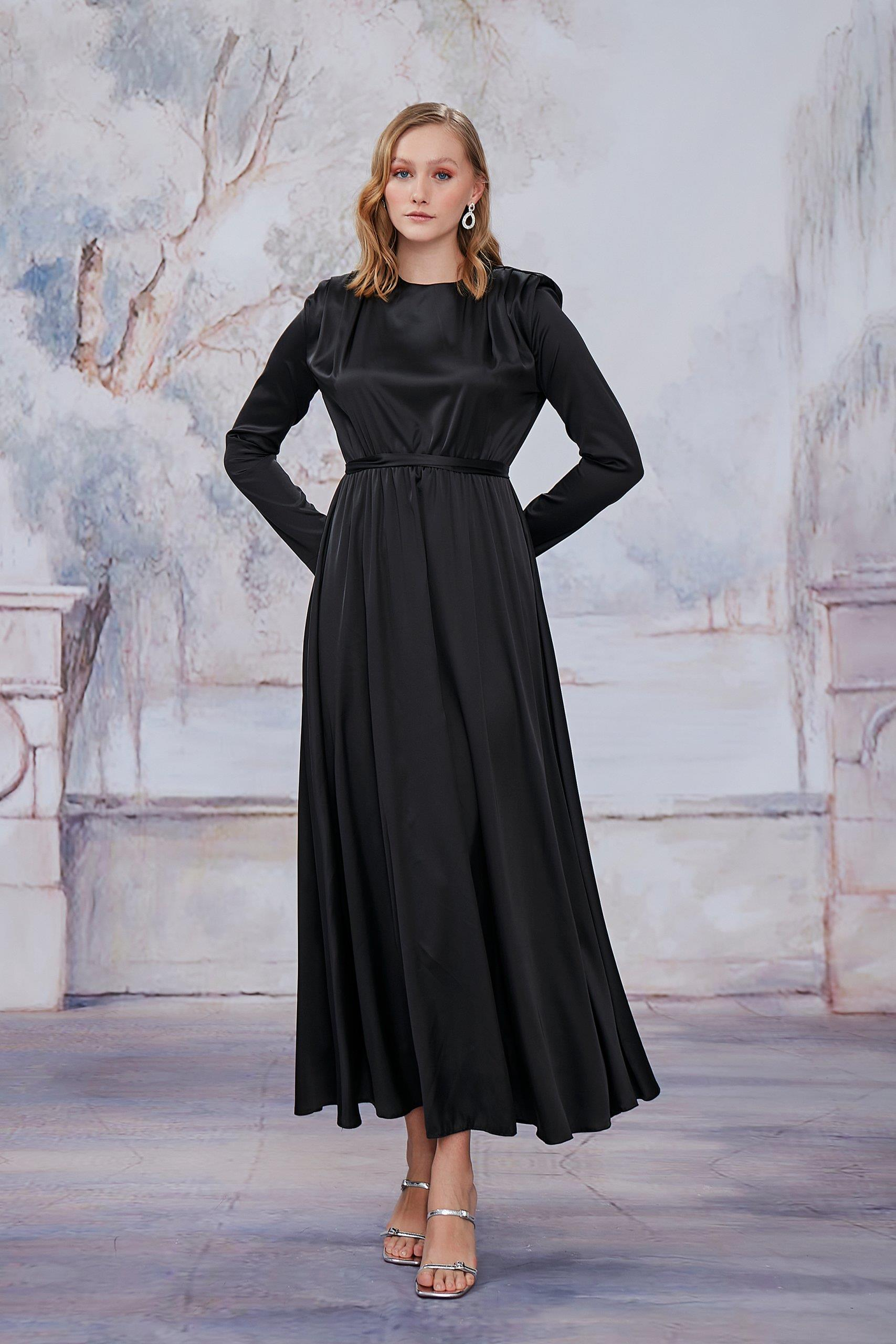Siyah Saten Vatkalı Elbise