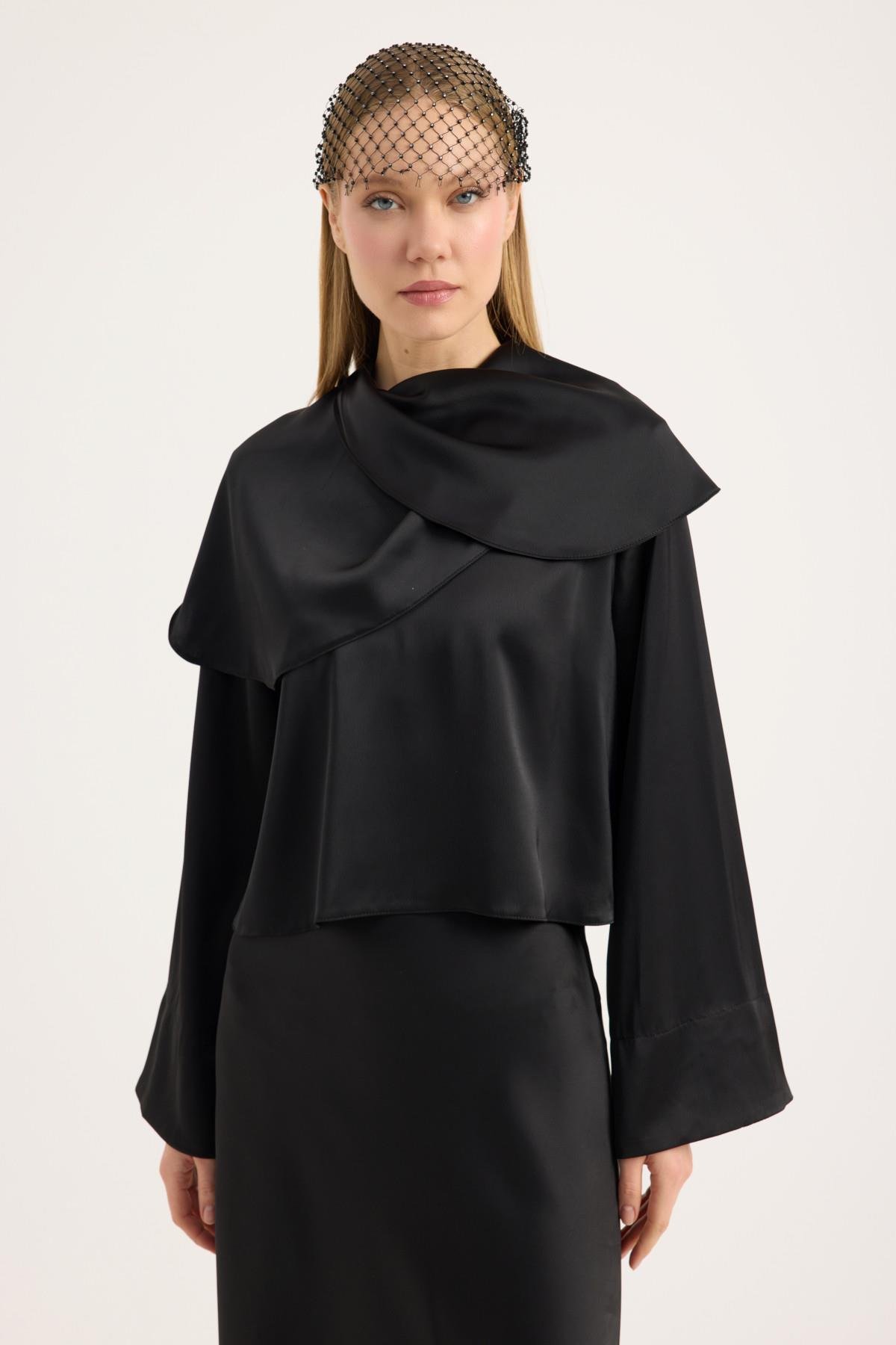 Geniş kol detaylı, Dik yaka, Zara saten kumaş, Ürün tam kalıptır.