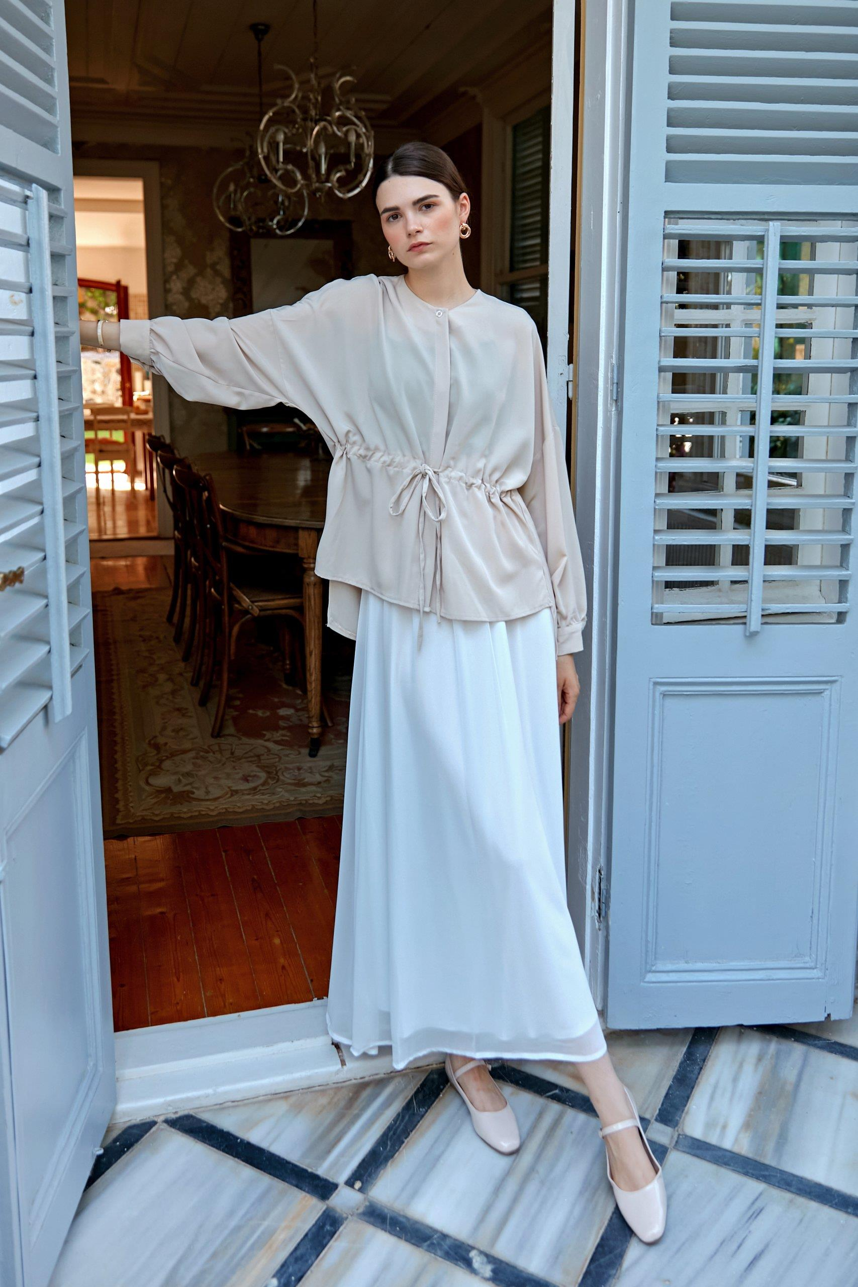 Krep kumaş, ayarlanabilir bel detayı, Düşük omuz, gizli düğme detaylıdır.
