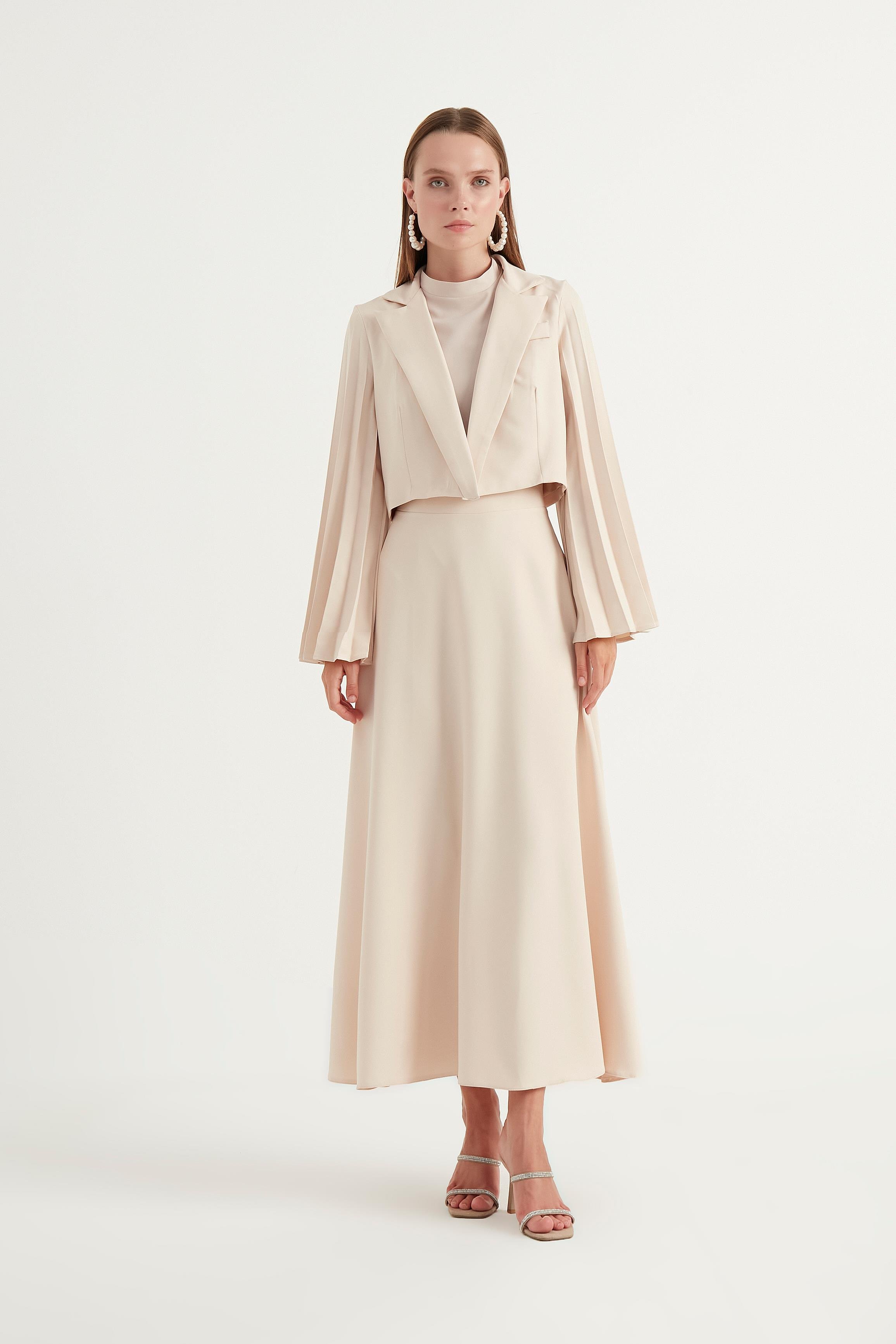 Pile kol detaylı, Double Krep kumaş, Etek yandan fermuarlı, Tam kalıptır. *Maksimum 30 derecede yıkayınız, tersten yıkayınız ve ütüleyiniz. 36-38 Beden Göğüs 82 cm Omuz 40 cm Kol boyu 63 cm Boy 43 cm Etek boyu 95 cm Etek Beli 76 cm 40-42 Beden Göğüs 86 cm Omuz 42 cm Kol boyu 61 cm Boy 43 cm Etek boyu 95 cm Etek Beli 80 cm