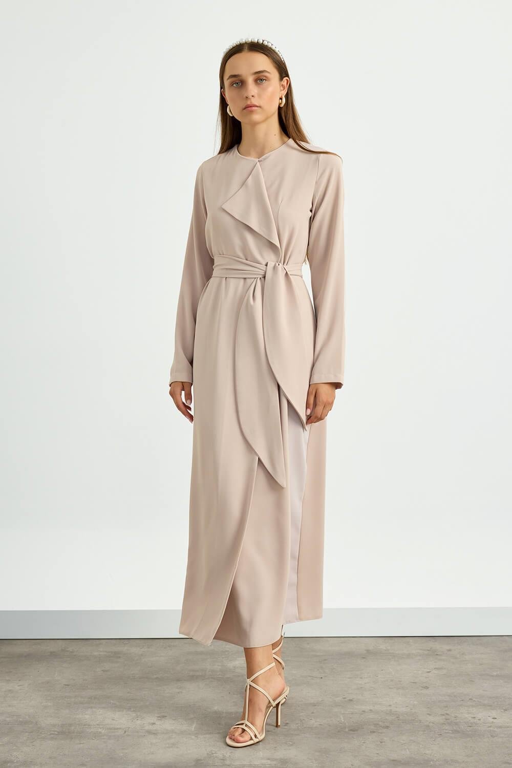Vizon Yaka Detaylı Kuşaklı Elbise