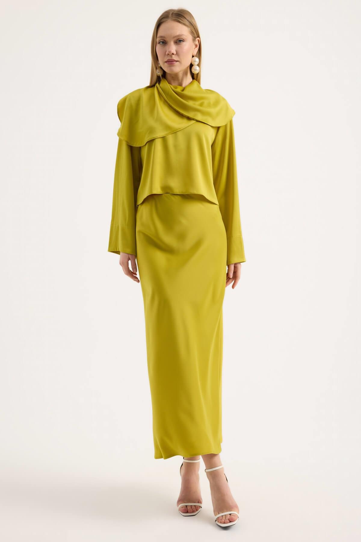 Geniş kol detaylı, Dik yaka, Zara saten kumaş, Ürün tam kalıptır.